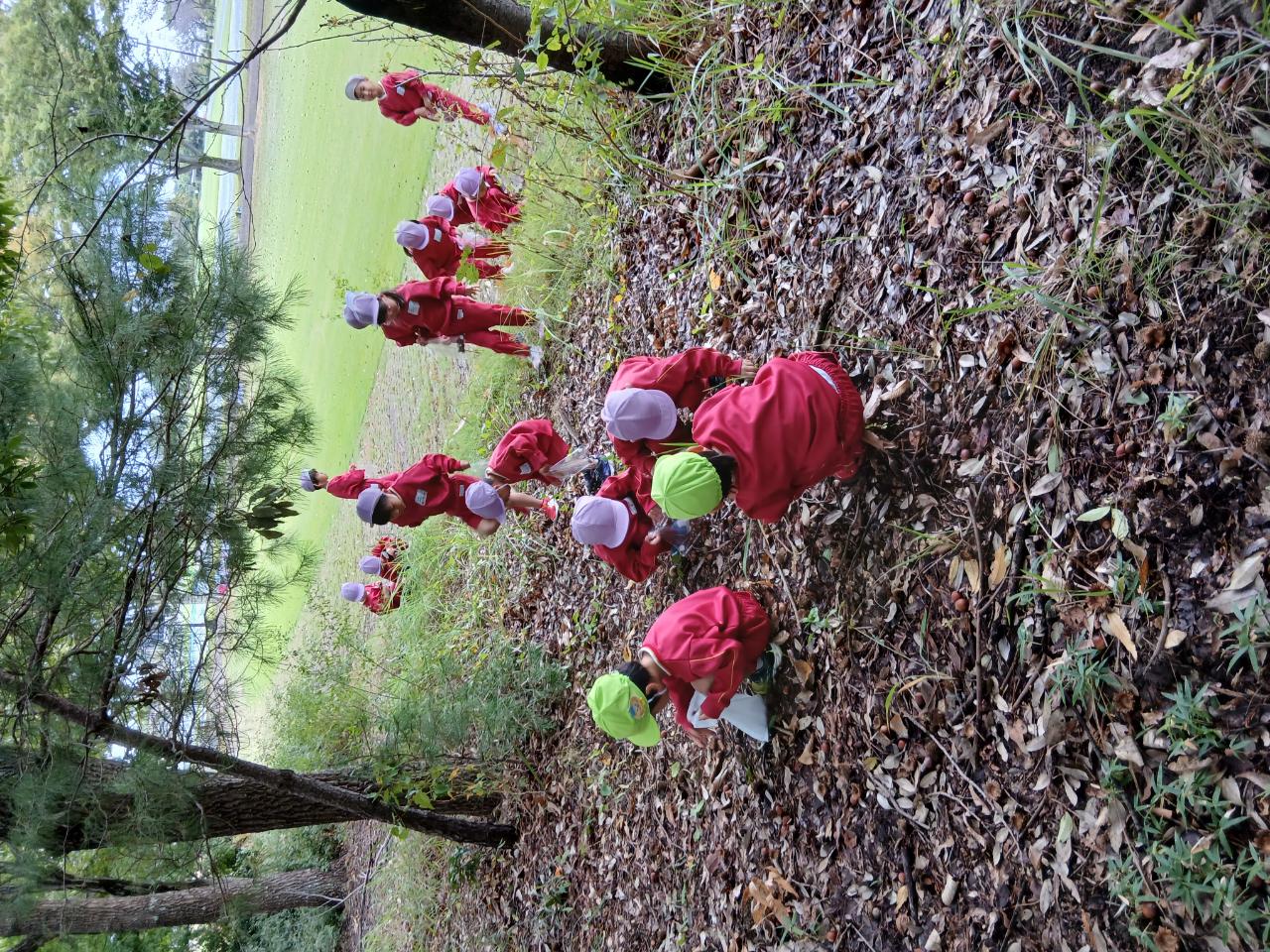 今日は、年中組・年少組・ねこ組のどんぐり拾い遠足です。芝生の広場で遊んで、どんぐりをいっぱい拾いました。これから楽しみにしていた お弁当とおやつ🍬🍘の時間です。お土産はもちろん、ドングリです
