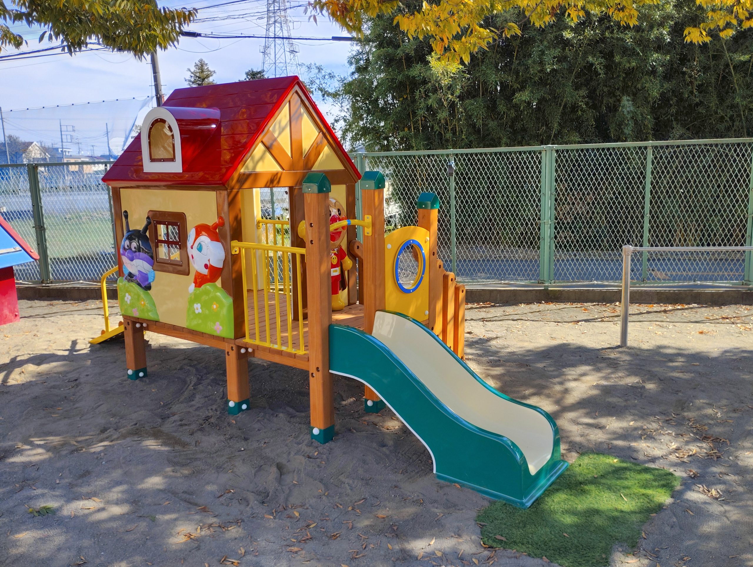 10月23日(大安)に新しい遊具、アンパンマンと森のロッジが、箕田幼稚園に来ました。2歳児でも遊べる楽しい遊具です。 名前にちなんで園庭の木の下に設置しました。