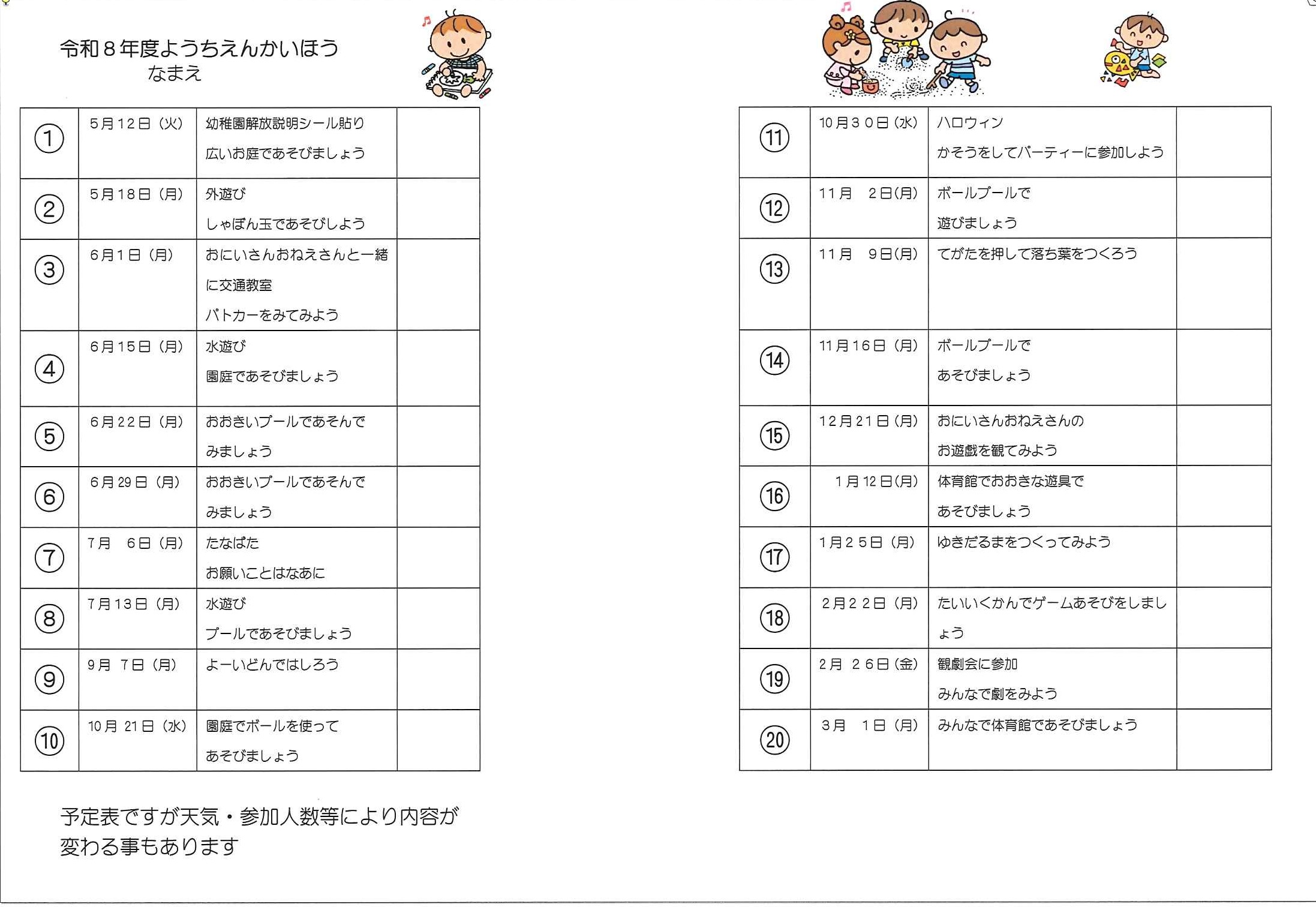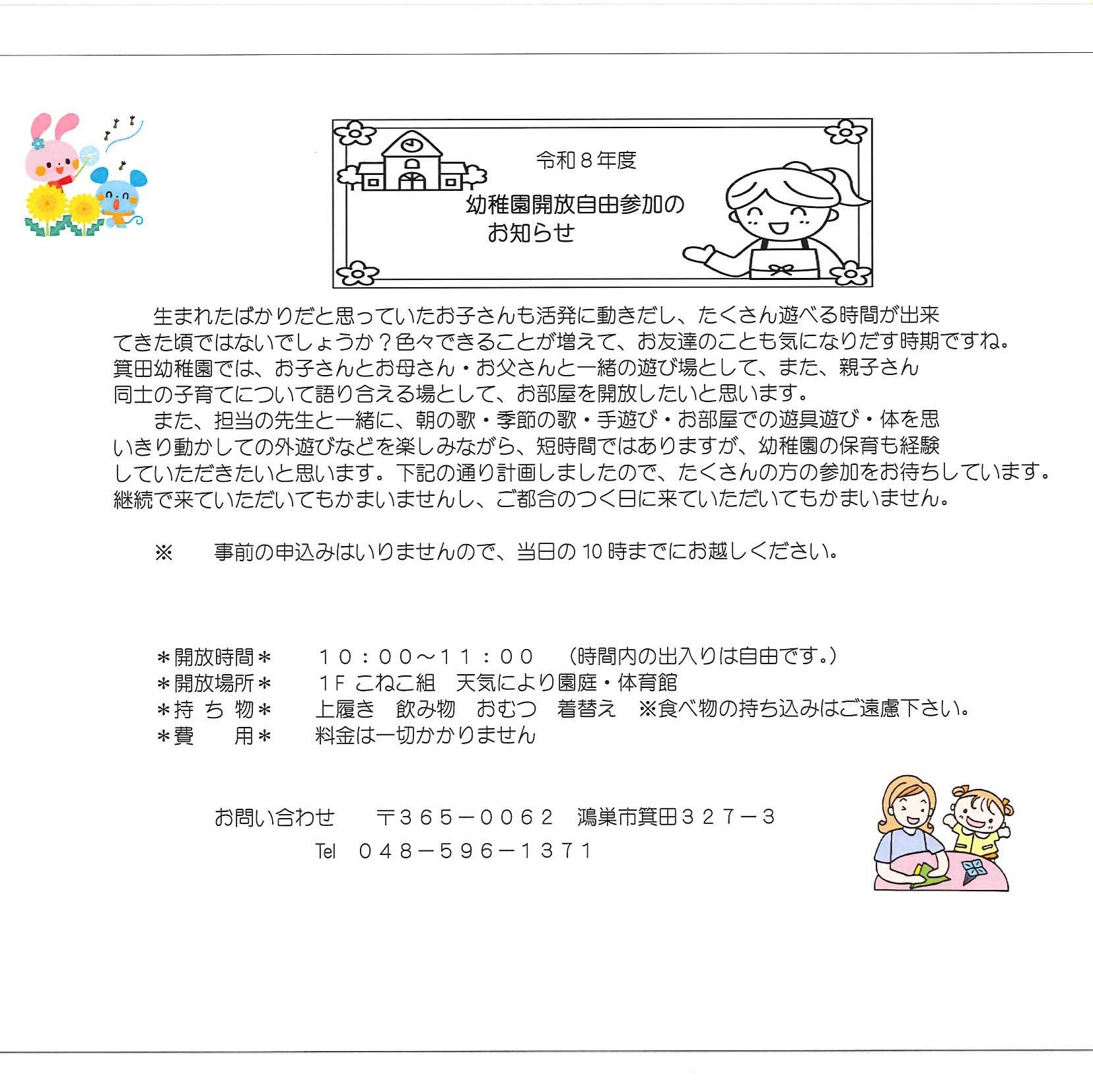 下記の内容で、令和8年度の園庭開放を実施いたします。